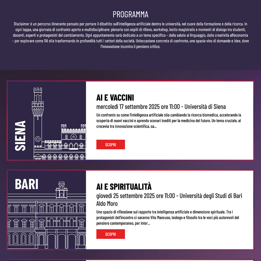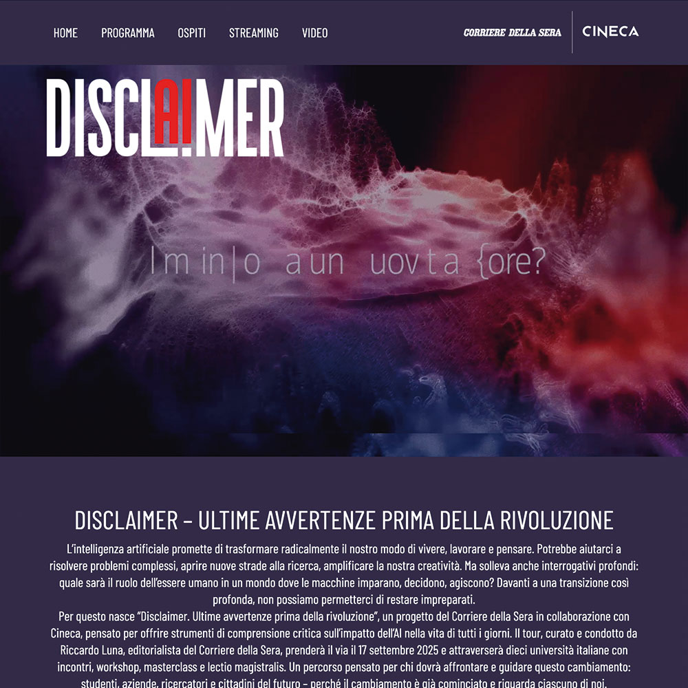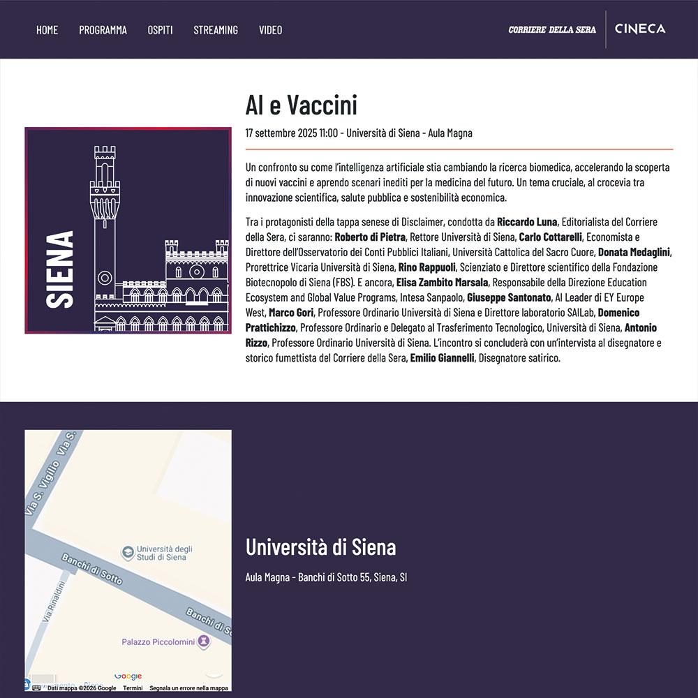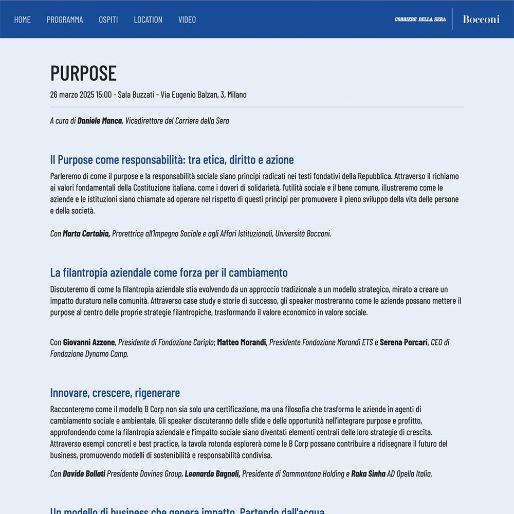 appoggio all'evento, con il programma e le bio dei ospiti, in doppia lingua IT/ENG. Erogazione in