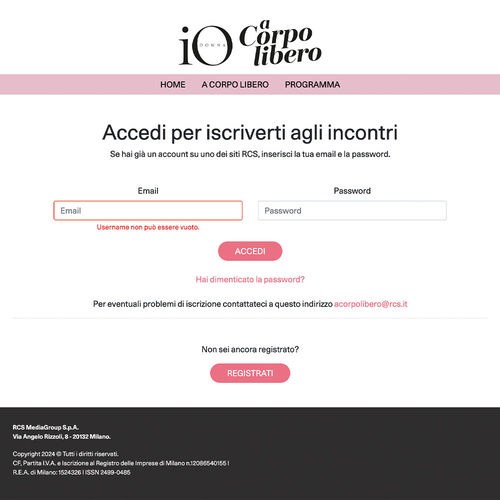 iscrizione online integrata con CRM di RCS. L'utente riceve un QRCode da mostrare all'ingresso,